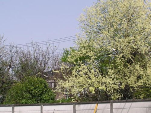 前述の人力検索では思ったような回答が集まらなかったので写真を公開します。 ▲この通りの高木で、幹が黒っぽい以外は全体が真っ白。 ▲少し近づいて撮影。濃い緑に見えるのは後ろにある別の木の葉です。この木のものではありません。 ▲なるべく近づいて写し…